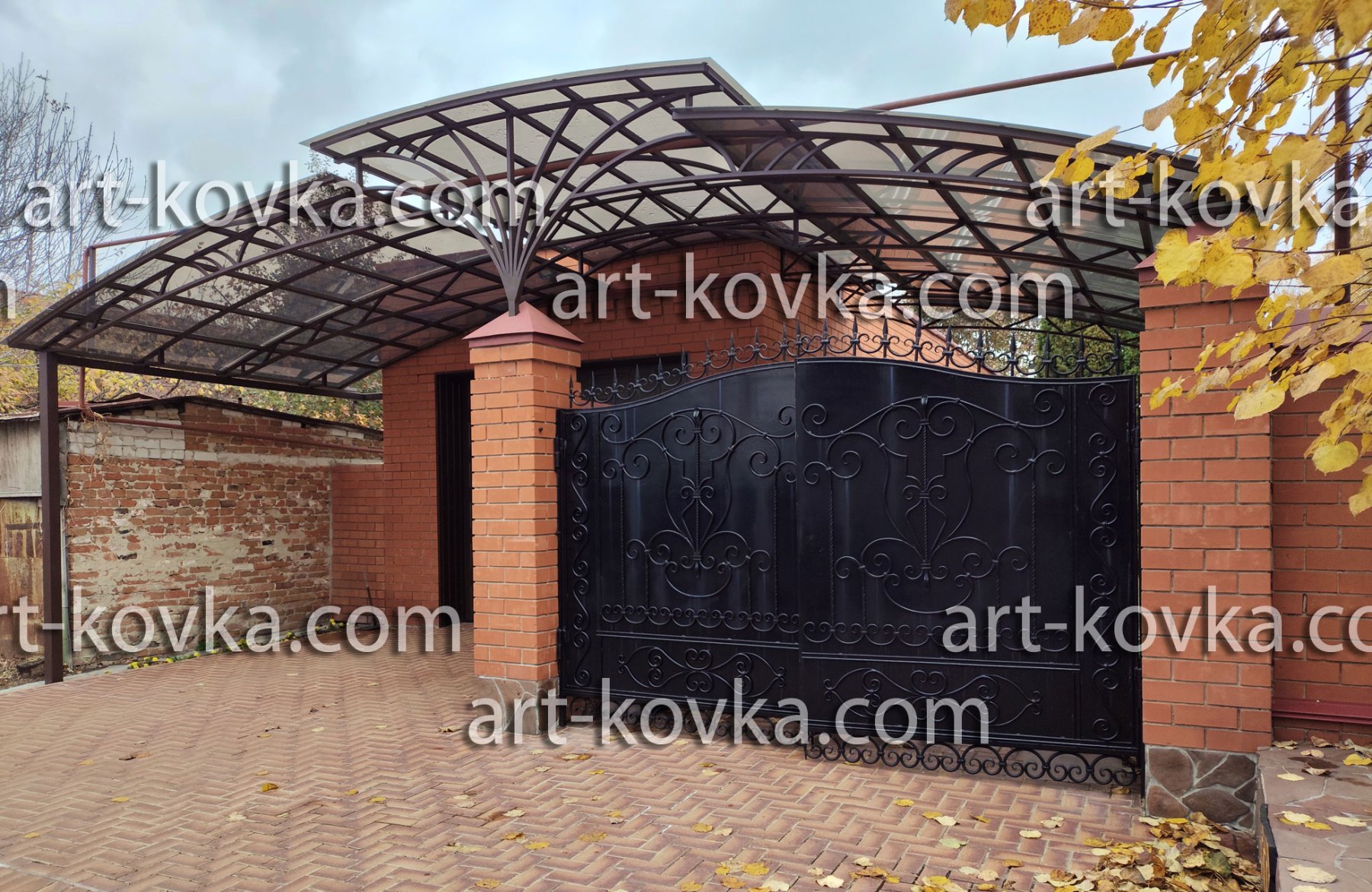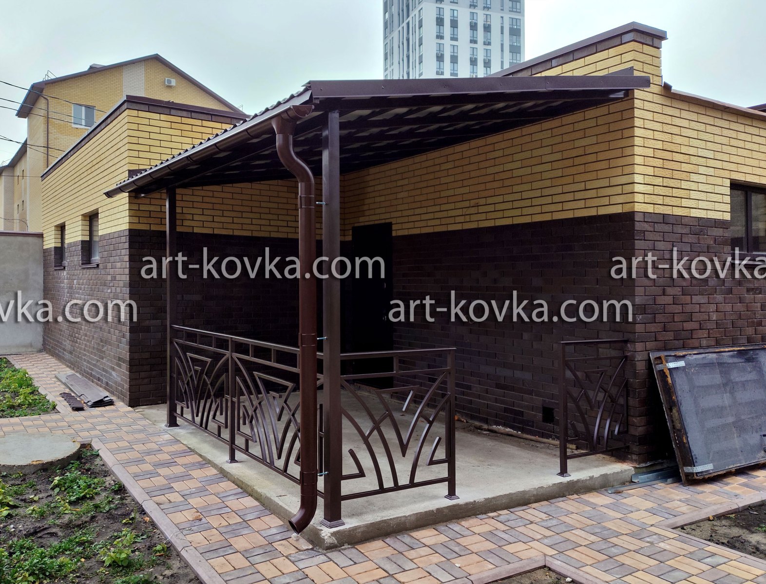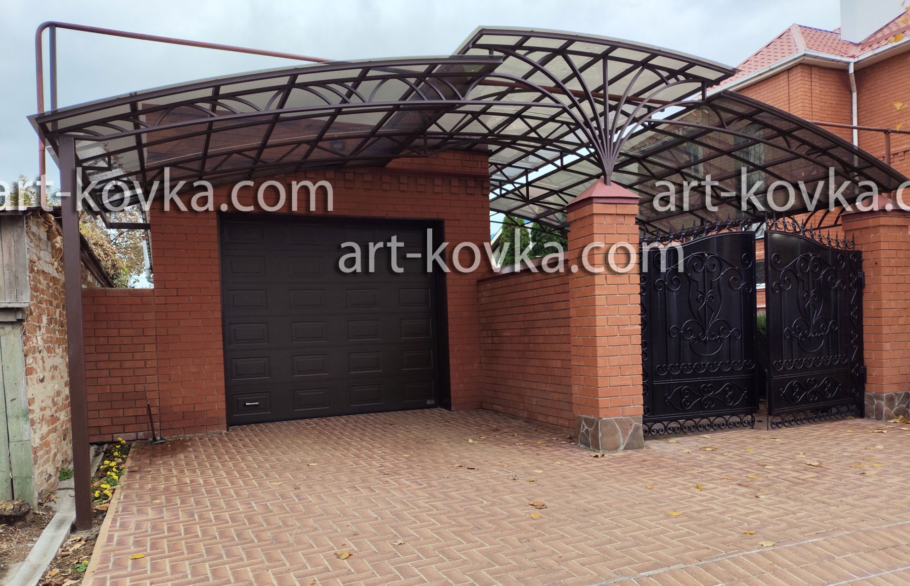 Для больших навесов подходит покрытие из сотового поликарбоната. Это недорогой и практичный материал, который многим уже пришелся по душе. Небольшие же козырьки , лучше смотрятся с покрытием из металлического листа. Мы работаем с обоими материалами